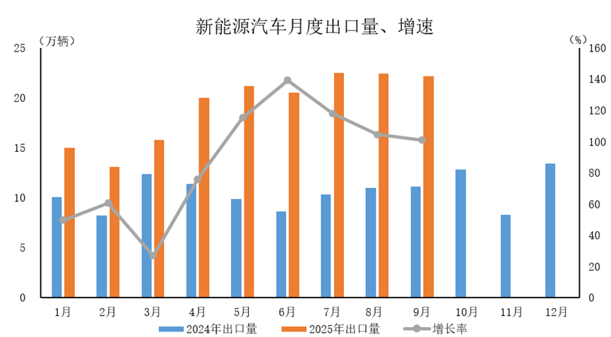2025年9月,新能源汽车出口22.2万辆,环比下降0.9%,同比增长1倍。
