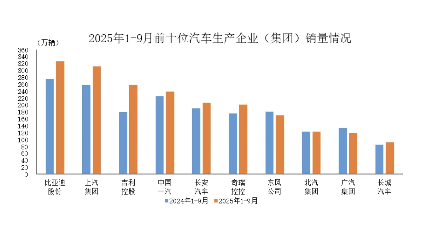 据中国汽车工业协会统计分析,2025年1-9月,汽车销量排名前十位的企业(集团)共销售2043 1万辆,占汽车销售总量的83 9%。在上述十家企业中