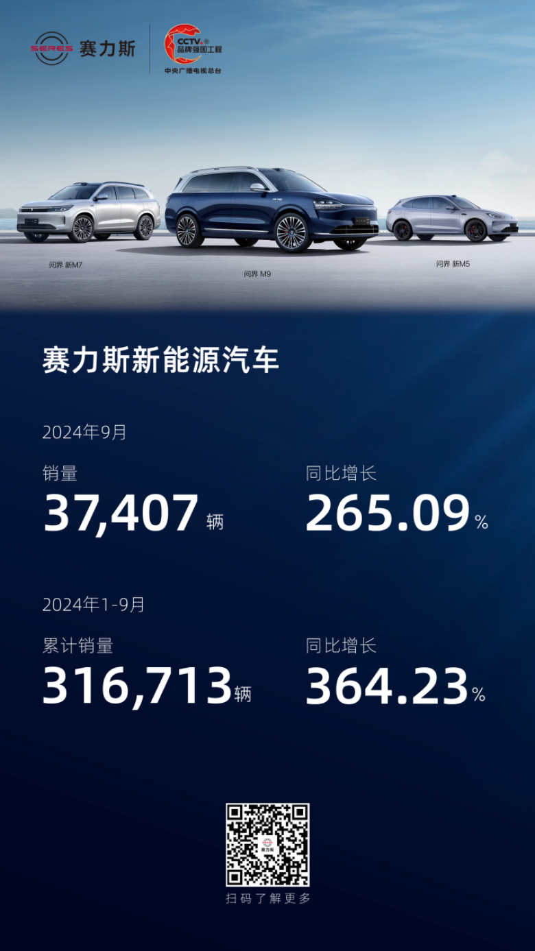 10月7日,赛力斯发布9月产销快报。数据显示,赛力斯新能源汽车9月销量达37407辆,同比增长265.09%,今年1-9月,赛力斯新能源汽车累计销量已达到316713辆,同比增长364.23%。