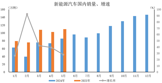 2025年5月,新能源汽车国内销量109.5万辆,环比增长6.8%,同比增长27.9%。