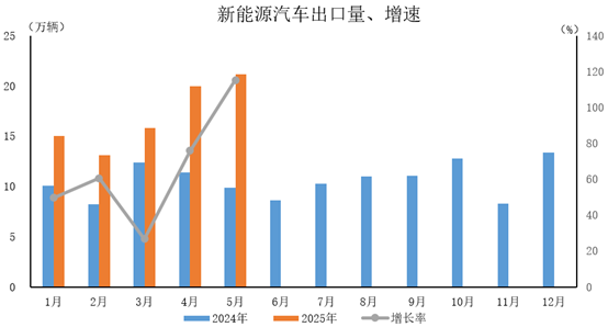 2025年5月,新能源汽车出口21.2万辆,环比增长6.1%,同比增长1.2倍。