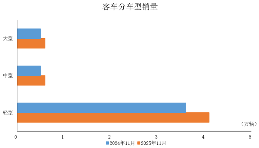 2025年1-11月,客车产销分别完成50.8万辆和51万辆,同比分别增长12.8%和13.2%。与去年同期相比,三大类客车品种产销均呈不同程度增长。