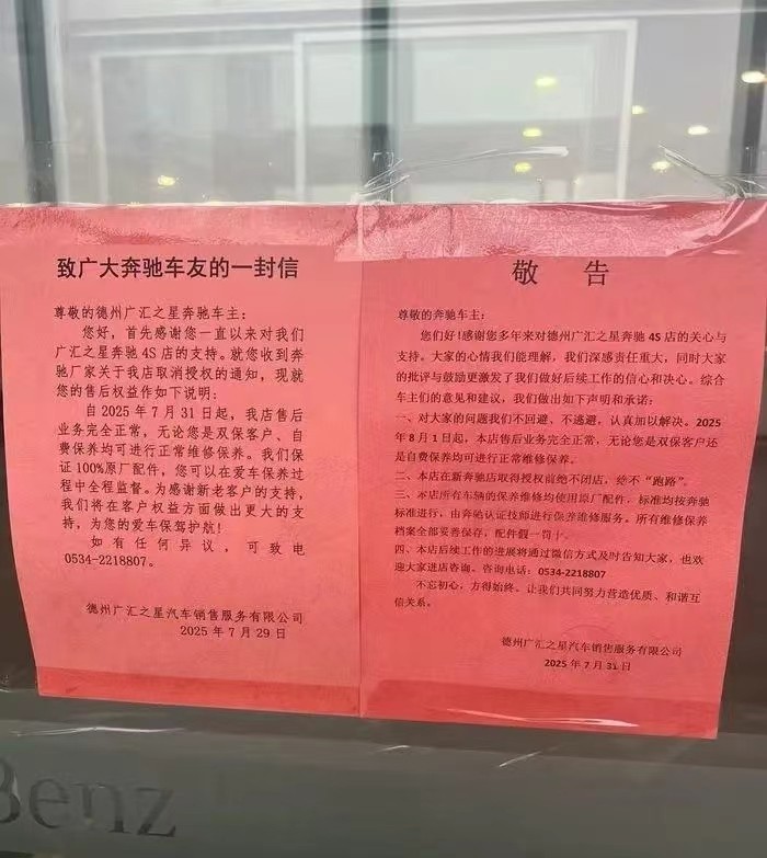 其实,梅赛德斯—奔驰的此类事件并非只出现在山东。据相关汽车行业媒体不完全统计,2025 年上半年全国范围内就有超 80 家奔驰授权经销商终止运营,覆盖 23 个城市,其中以宝利德、广汇两大集团为闭店重灾区。面对车主的维权诉求,奔驰官方均声称不承担连带责任。